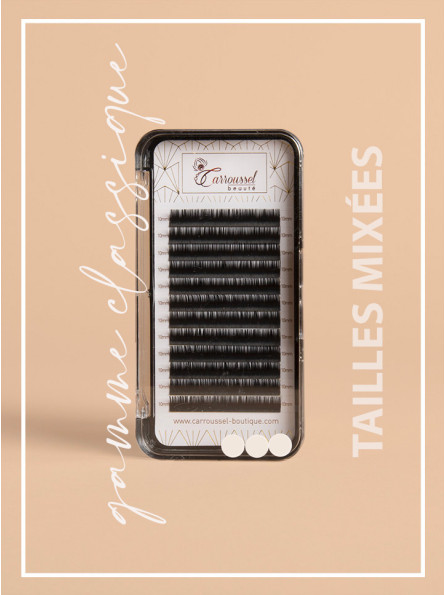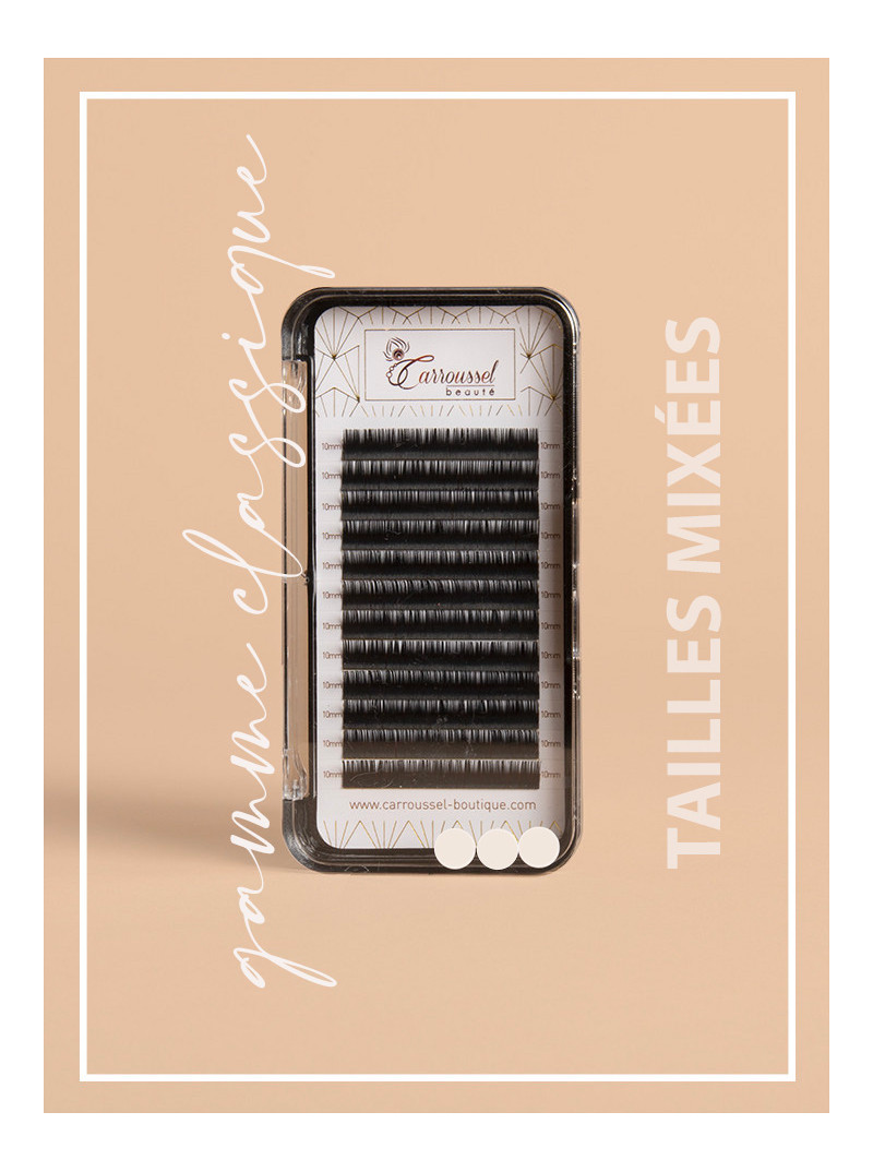 La Gamme Classique de Carroussel Beauté, que l’on distingue avec sa boîte noire, se caractérise par des extensions de cils à la base ronde et à la pointe effilée, à l’aspect très proche de cils naturels.