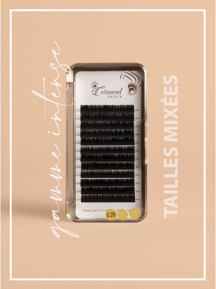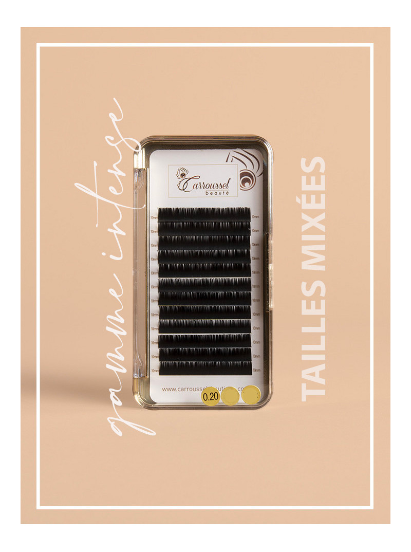 La Gamme Intense de Carroussel Beauté, qui se caractérise par sa palette dorée, a été conçue pour obtenir un résultat extravagant et un effet maquillé. La base carrée des extensions de cils de cette gamme permet un ras de cil intense, pour un effet eye-liner.