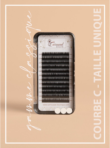 La Gamme Classique de Carroussel Beauté, que l’on distingue avec sa boîte noire, se caractérise par des extensions de cils à la base ronde et à la pointe effilée, à l’aspect très proche de cils naturels.