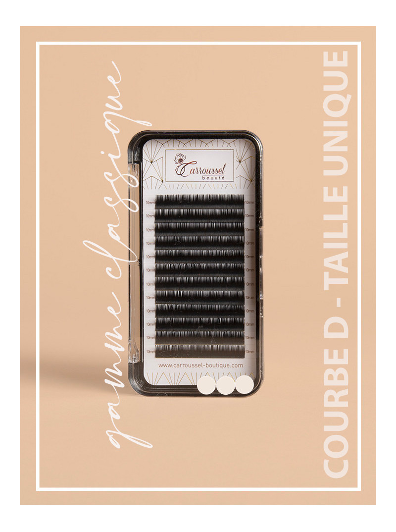 La Gamme Classique de Carroussel Beauté, que l’on distingue avec sa boîte noire, se caractérise par des extensions de cils à la base ronde et à la pointe effilée, à l’aspect très proche de cils naturels.