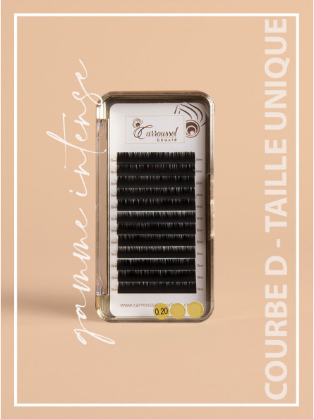 La Gamme Intense de Carroussel Beauté, qui se caractérise par sa palette dorée, a été conçue pour obtenir un résultat extravagant et un effet maquillé. La base carrée des extensions de cils de cette gamme permet un ras de cil intense, pour un effet eye-liner.