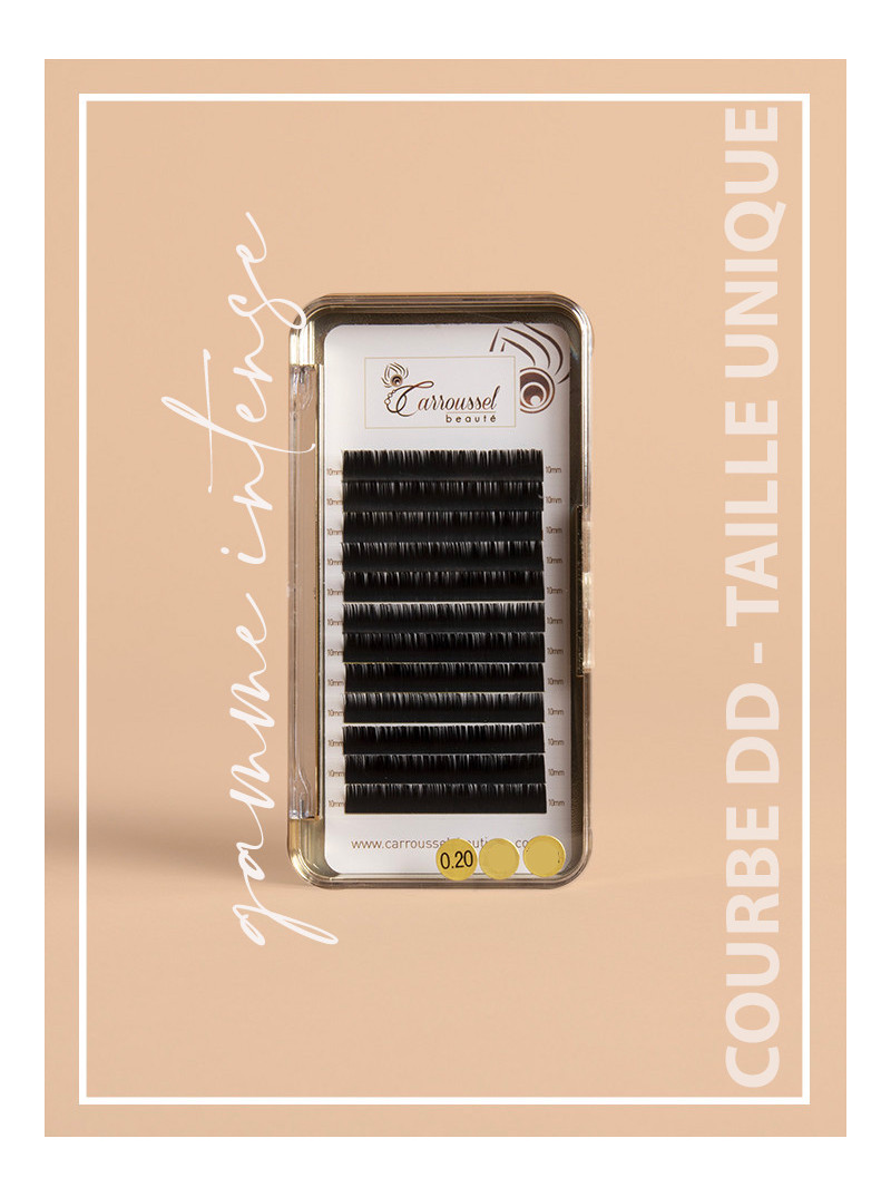 La Gamme Intense de Carroussel Beauté, qui se caractérise par sa palette dorée, a été conçue pour obtenir un résultat extravagant et un effet maquillé. La base carrée des extensions de cils de cette gamme permet un ras de cil intense, pour un effet eye-liner.